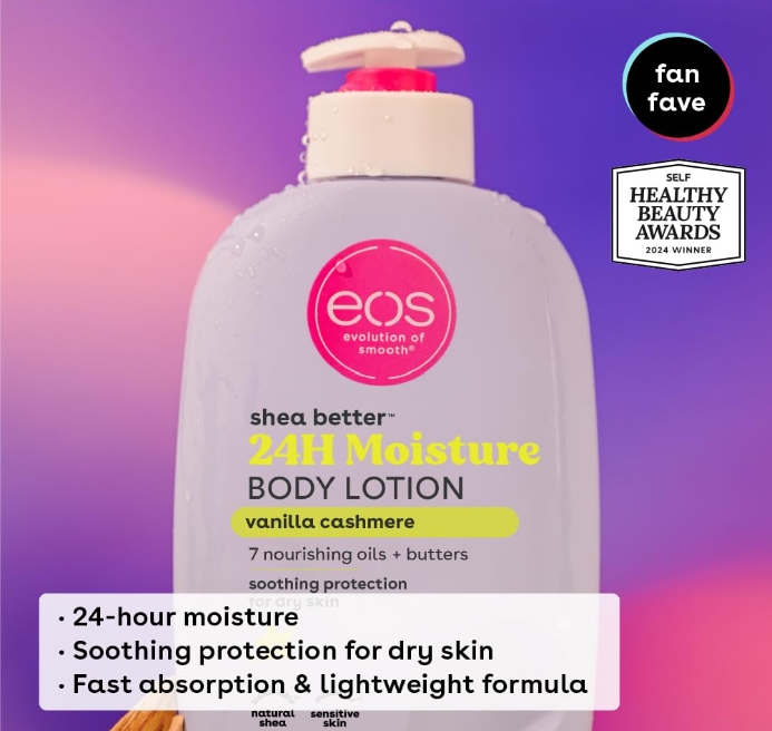 SHEA BETTER BODY LOTION: Our sweet and nuzzly Vanilla Cashmere scent contains fragrance notes of whipped vanilla, soft musk and cozy caramel. eos 24-hour hydration body lotion is made with natural ingredients to leave your skin smooth from head-to-toe.